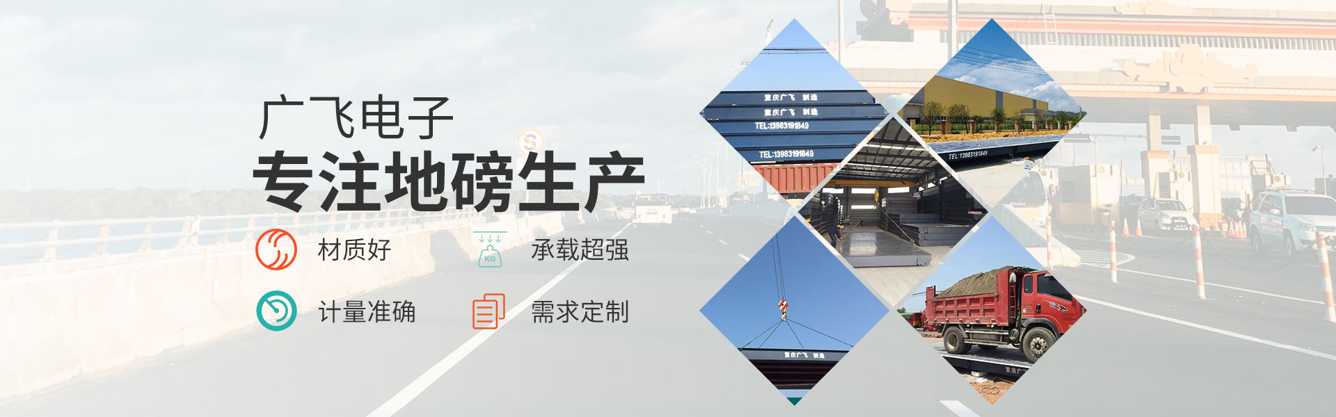 重慶廣飛電子有限公司,是一家集衡器生產、技術研發、產品銷售及售后服務于一體的高科技企業。 產品囊括電子汽車衡(電子地磅)、無人值守地磅稱重管理系統、電子地上衡、智能稱重管理系統、電子軌道衡、電子吊秤、電子臺秤、電子皮帶秤、鏟車秤、公路超載超限系統等全系列稱重產品。